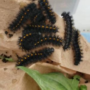 Most animals’ cells would burst if they reached below freezing because the water inside of them would form jagged crystals. But our caterpillars can concentrate chemicals called cryoprotectants inside of their cells, so that their cells don’t actually freeze solid and burst. This is comparable to filling their cells up with antifreeze. So, even if they are cold as little caterpillar-popsicles, our Taylor’s checkerspots can survive until it’s time to resume eating and growing alongside all the other animals we look forward to seeing in the spring.