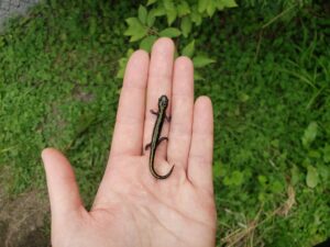 Leaving a bit of ‘mess’ in your yard can pay off – in biodiversity! Here’s a long-toed salamander that is living under a log near our lab, and enjoys our (very) relaxed approach to gardening and lawn care.