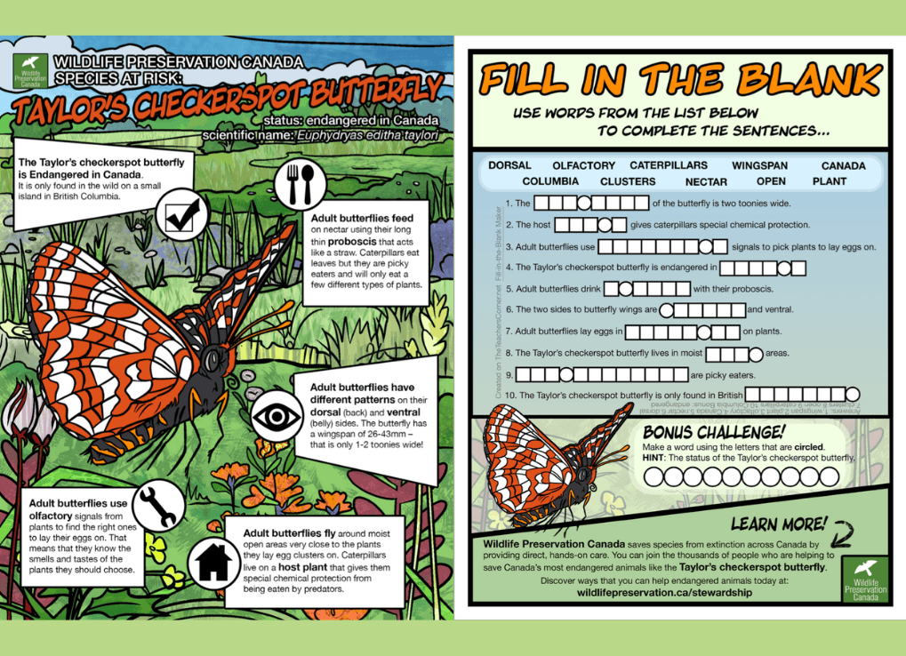 This spotlight is on the Taylor’s checkerspot butterfly, which is listed as Endangered in Canada.