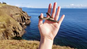 The first snake of spring was this small garter snake, out basking in the early March sun on Helliwell Provincial Park’s bluff trails. This snake shares the excellent sea-side views of its habitat with a diverse set of animals.