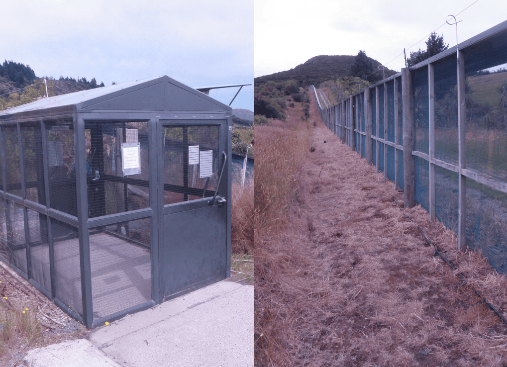The entry gate (left) and perimeter predator-resistent fence (right) at the Orokonui Ecosanctuary.