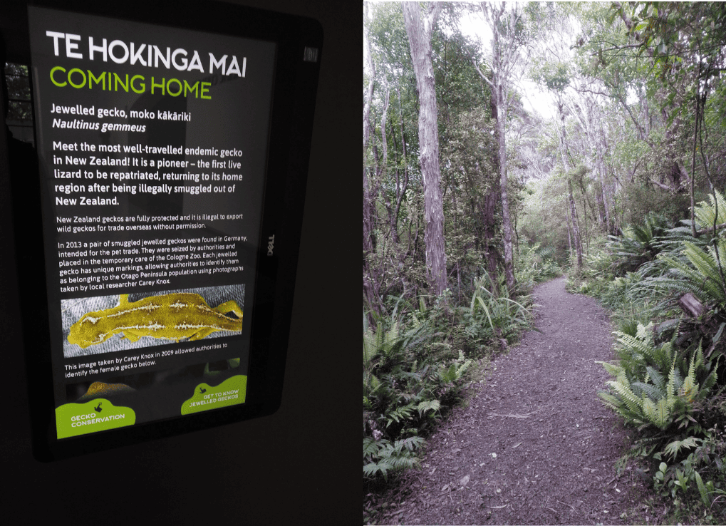 (Left) Jewelled Gecko outreach display at the Otago Museum, in the City of Dunedin, telling the story of two geckos illegally smuggled out of the country for the pet trade. (Right) Tramping (aka “hiking” in Kiwi lingo) the beautiful trails of the Orokonui Ecosanctuary.