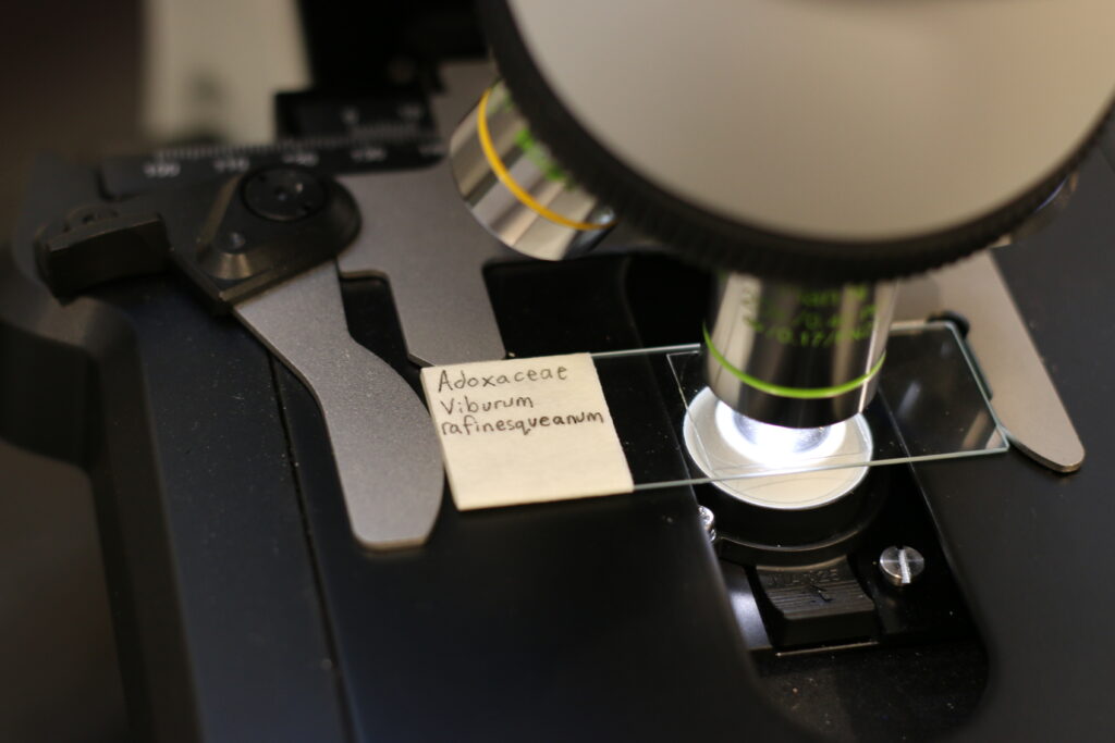 A sample slide containing the pollen of downy arrowwood (Viburnum rafinesqueanum), under the microscope. [© Patricia Prelich]