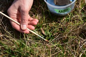 With paintbrushes, tiny caterpillars are brushed out of their little plastic cups and placed into carefully selected micro-patches of habitat. Then a small flag is labelled and staked into the ground at each release point. This action was repeated many times, by many hands this March, and resulted in over 1200 caterpillars being released into restored habitat. All of this rather un-dramatic paint brush work will, hopefully, result in a busy butterfly flight season in May of this year.