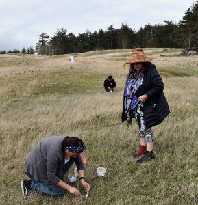 Clockwise from bottom: K’ómoks First Nation Chief Nicole Rempel, Councillor Katherine Frank and Elder Donna Mitchell help Taylor’s checkerspot larvae find the perfect spot in Helliwell Provincial Park. (Photo by Chris Junck of GOERT)