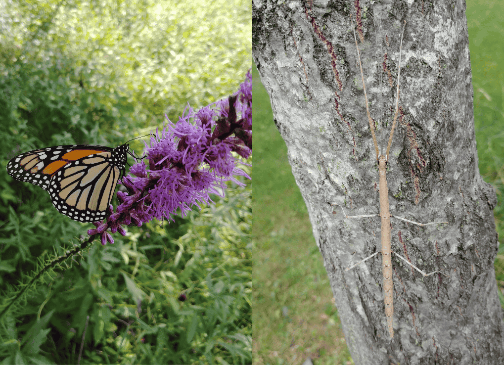 (Left) A monarch butterfly resting on a dense blazing start. Two species at risk in one photo! Monarchs are classified as special concern in Ontario and the dense blazing star is threatened. (Right) A walking stick insect that was crawling on the pants of my field partner at the time (Kaitlyn Hall).