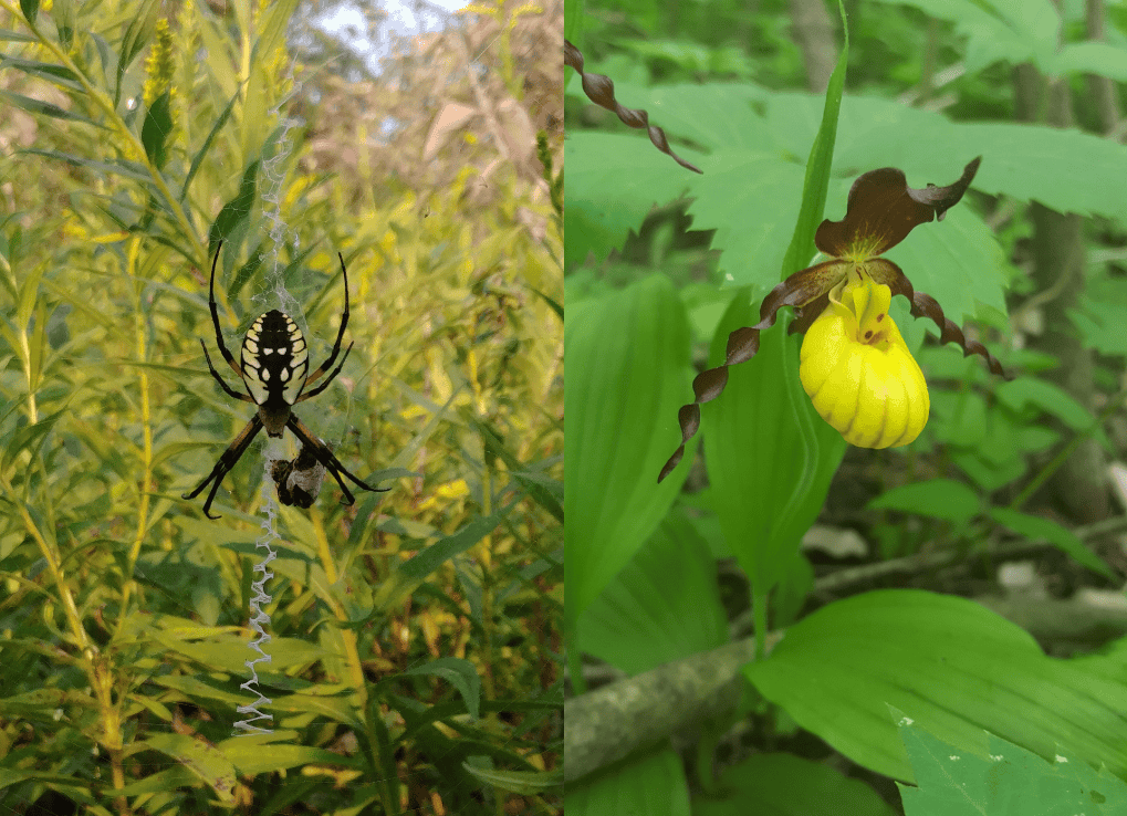 (Left) An orb weaver enjoying an insect meal. (Right) This is a small yellow lady-slipper orchid, This flower is a rare sight and blooms in late May-June.