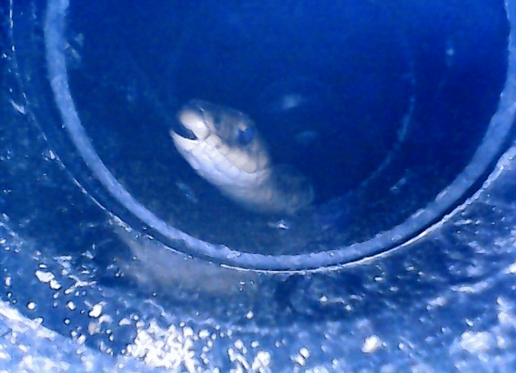 Watching the snakes via borescope over-winter was a lot of fun. I was able to observe the water level in the bottom of the artificial hibernacula changing over time and watch the snakes moving underwater. I also noticed that their behavior changed with the temperature. One particular artificial hibernacula has five younger snakes that would cluster together on cold days and become what I described on the survey sheet as a “snake ball”. On warmer days I had to make sure they didn’t escape; they were so active and curious about the borescope and would come up to it flicking their tongues (like the individual in the image above).