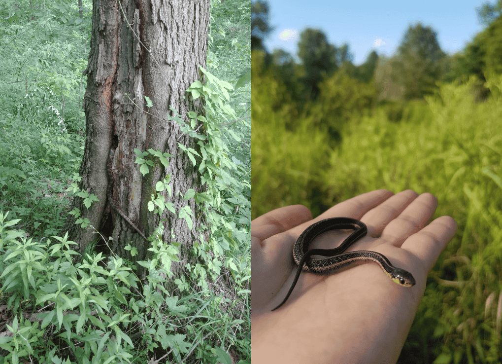 (Left) This eastern fox snake was sharing this hollow tree crevice with another eastern foxsnake. Sadly we were so excited about spotting the first one that the second one got away. (Right) A Butler’s gartersnake found under a cover object during a survey.
