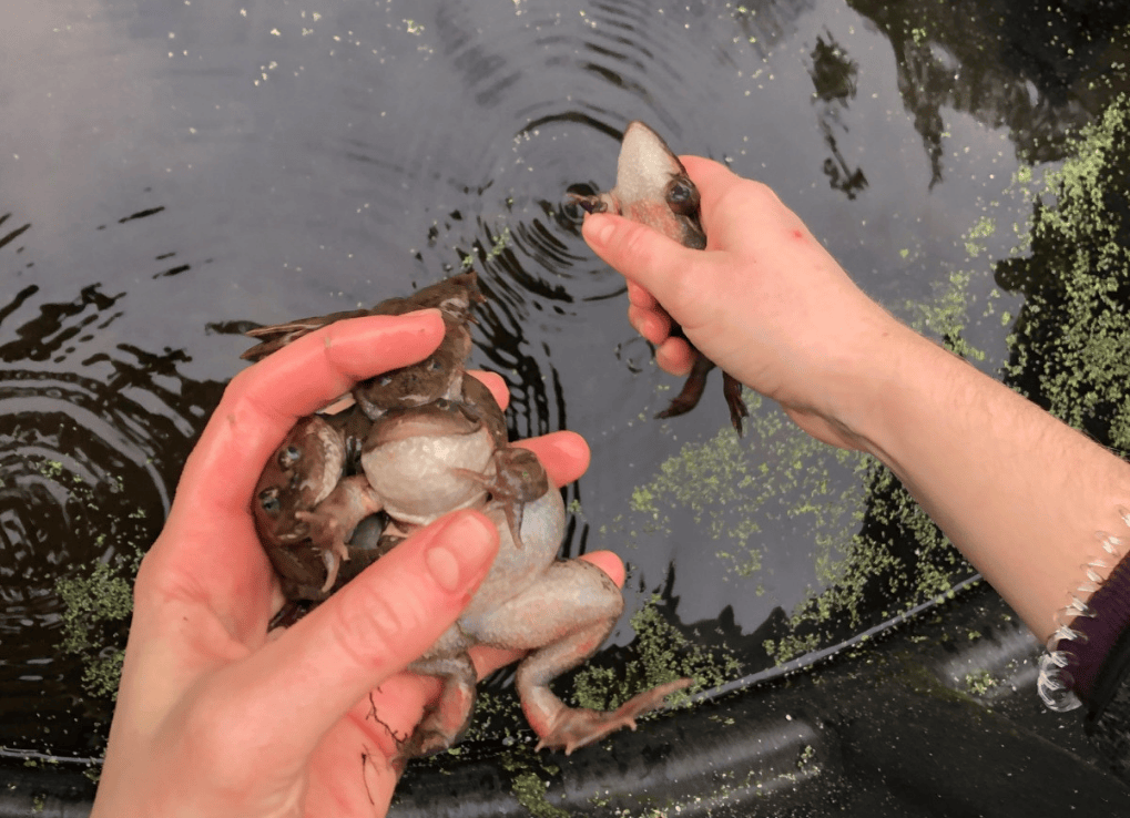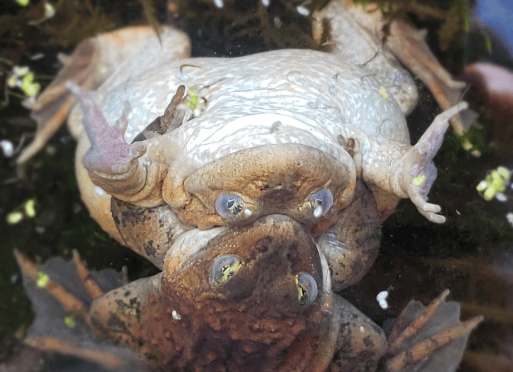 Our frogs, who are native to this area, have bravely survived winter in their outdoor mini-ponds and are starting to exhibit breeding behaviour. During our daily checks, we recently have noticed these amphibians in a position called amplexus, which is latin for “embrace”. This is a breeding behaviour in which the male frog grasps the female from behind and holds on for dear life. Here, the male patiently waits for the female to expel an egg mass, which he will then fertilize externally. Sometimes, however, the frogs get overzealous and we will come across a “ball” of frogs. Part of our job is to give the lady’s a helping hand, ensuring only one male is holding on at a time. Even with this set back, we can are expecting to see egg masses any day now. This is very exciting news for the future of this endangered species.