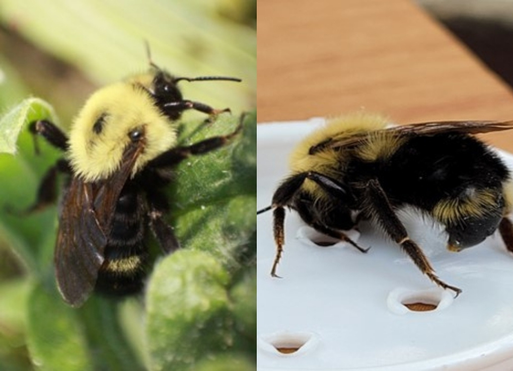 (Left) A lemon cuckoo bumble bee. Photo: P. Smale. (Right) A Fernald cuckoo bumble bee female. Photo: C. Blair. Two of the five cuckoo bumble bee species in Ontario. Note the enlarged and curved stinger displayed here by the Fernald cuckoo.