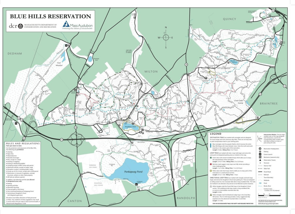 Map of the Blue Hills Reservation, on the outskirts of Boston, MA, showing its extensive trail network