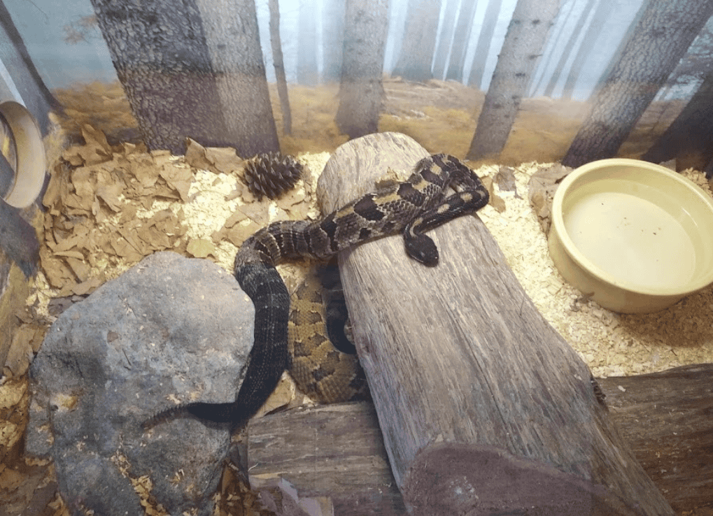 The colour variations present in the Timber Rattlesnake are quite attractive. The Blue Hills Trailside Museum had both “yellow” and “black” phases on display for my herpetological enjoyment.