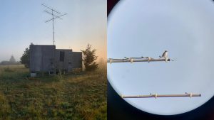 A Motus tower alongside a pre-release enclosure in Napanee and a shrike perched on the antennae. Photos: Paula Gomez Villalba