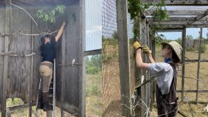 The Carden field team (Katelyn West and Olivia Trudeau) adding fresh cover to the pre-release enclosures. Photos: Katelyn West